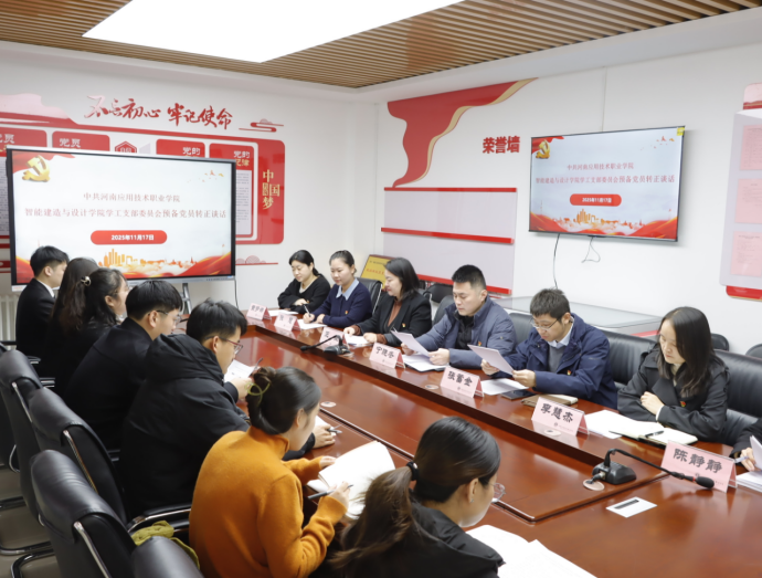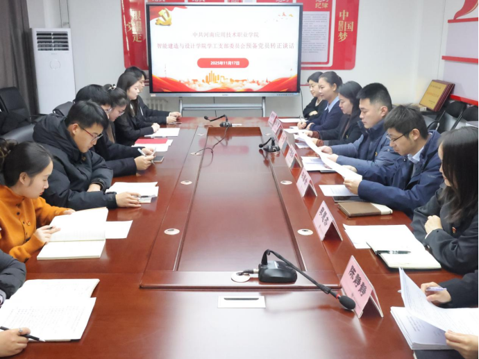 为深入学习贯彻党的二十届四中全会精神,扎实推进党员队伍建设,严把党员发展质量关,智能建造与设计学院学工党支部于2025年11月17日在开封北院办公楼B417党建活动室召开预备党员转正大会,本次会议由党总支副书记张蓄金主持,学工党支部全体党员教师及刘晨阳、柴静怡两名预备党员参与本次会议。