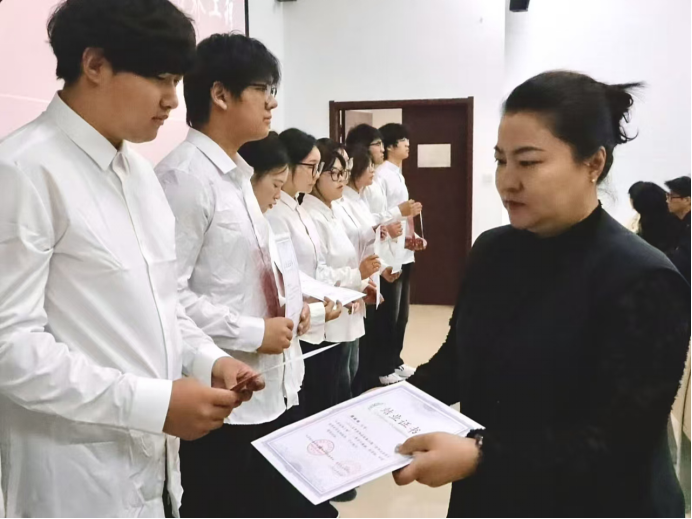 王莹为爱国故事的获奖学生和青马班的优秀同学颁发荣誉证书,对大家的辛勤付出与优异成绩给予充分肯定,鼓励全体学生干部以先进为标杆,主动担当、积极履职。随后,王莹针对近期重点工作进行两点部署,一是全面推进校运动会各项动员工作,细化人员组织、氛围营造等工作,激发学生参与热情,展现学院良好风貌;二是充分发挥二年级学生干部的引领带动作用,以自身为榜样,带领学生会一年级学生干部明晰职责、扎实做好本职工作,凝聚学生干部队伍力量,助力学院工作提质生效。