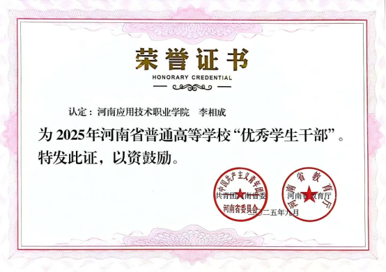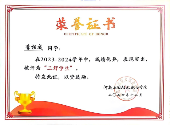 在担任班长期间,李相成展现了他细致入微、体贴关怀的一面。他始终将同学们的冷暖放在心上:有同学生病,他主动帮忙整理笔记、送饭送药;有同学因学业压力情绪低落,他耐心开导,分享经验;天气变化,他及时提醒大家增减衣物;同学间出现矛盾,他第一时间介入调解,化解隔阂。这些看似平凡的小事,却如春雨般滋润着班集体。他温暖的举动,让班级充满家的温度,也成了同学们最信赖的贴心人。在他的带领下,造价2301班于2024年12月荣获校级“先进班集体”称号,2025年荣获省级“先进班集体”称号。