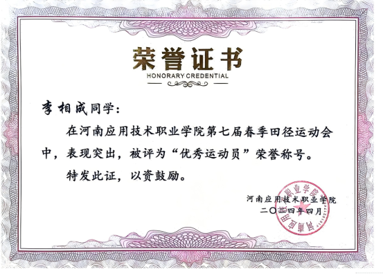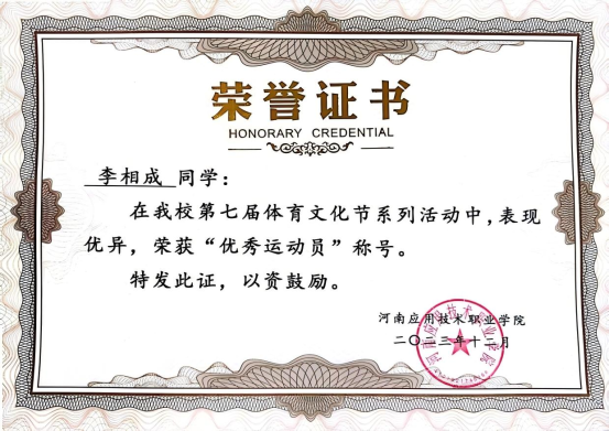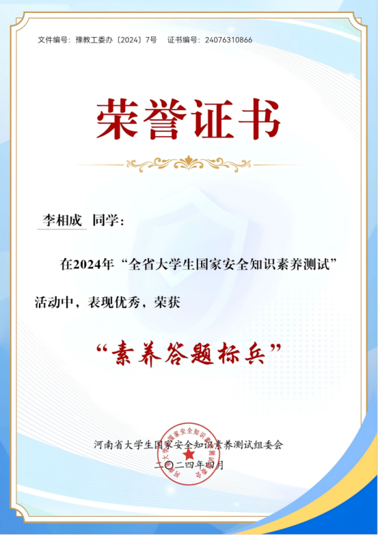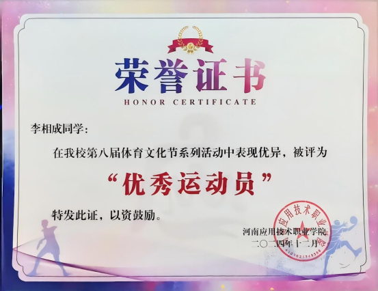 李相成在书山题海中奋勇攀登的同时,还积极投身于sunbet官网学生工作,凭借出色表现,他在2024年当选“sunbet官网学生会主席”。任职期间,李相成时刻以身作则,严于律己,用实际行动诠释着责任与担当。他将军旅生涯锤炼出的责任意识与高效执行力注入每一项工作,带领学生会成员积极开展一系列丰富多彩且富有意义的活动。他注重团队建设,经常组织大家进行交流学习,提升团队的综合素质和工作能力。他积极组织各类文体活动,如运动会、文艺晚会等。在他的带领下,学生会成员们团结协作,高效完成了一场又一场活动,为校园文化建设添上了浓墨重彩的一笔,赢得师生们一致好评,荣获“优秀学生干部”称号。