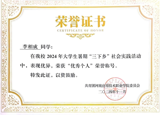 2024年,李相成积极响应号召,与同学们一同前往河南省兰考县开展“三下乡”社会实践活动,重点关爱当地的留守儿童。那段时间,他和团队成员为孩子们精心设计并开设了丰富多彩的课程,既有语文、数学等基础学科的辅导,也有绘画、音乐、体育等拓展视野、培养兴趣的素质教育内容,极大丰富了孩子们的暑期生活。
